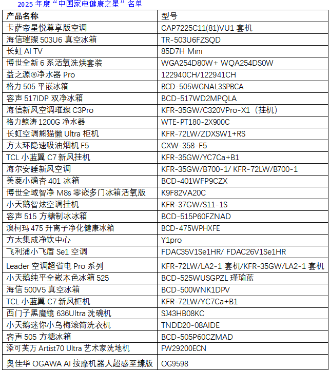 主辦方組織專家從產品健康性能、技術特點、設計理念及應用狀況等進行評審,最終29款年度熱銷健康家電產品(詳見下表)因在產品性能、技術特點、設計理念、應用場景上緊扣“健康”發展趨勢,滿足消費者健康需求,通過層層選拔脫穎而出,成為2025年度“中國家電健康之星”。