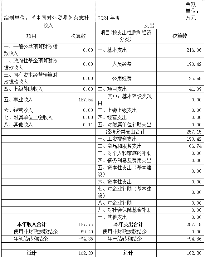 根據(jù)《財政部關(guān)于批復(fù)中國貿(mào)促會2024年度部門決算的通知》(財行〔2025〕158號),經(jīng)審核,批復(fù)雜志社2024年度決算如下: